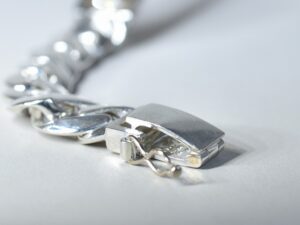 特注で製作した金具(中折れクラスプ)部分のセーフティー、丁番芯棒にはk18ホワイトゴールドを使って