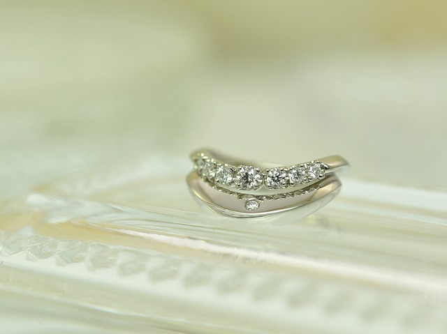 お客様のお手持ちの結婚指輪は、強いウェーブラインが特徴のV字型のデザイン!